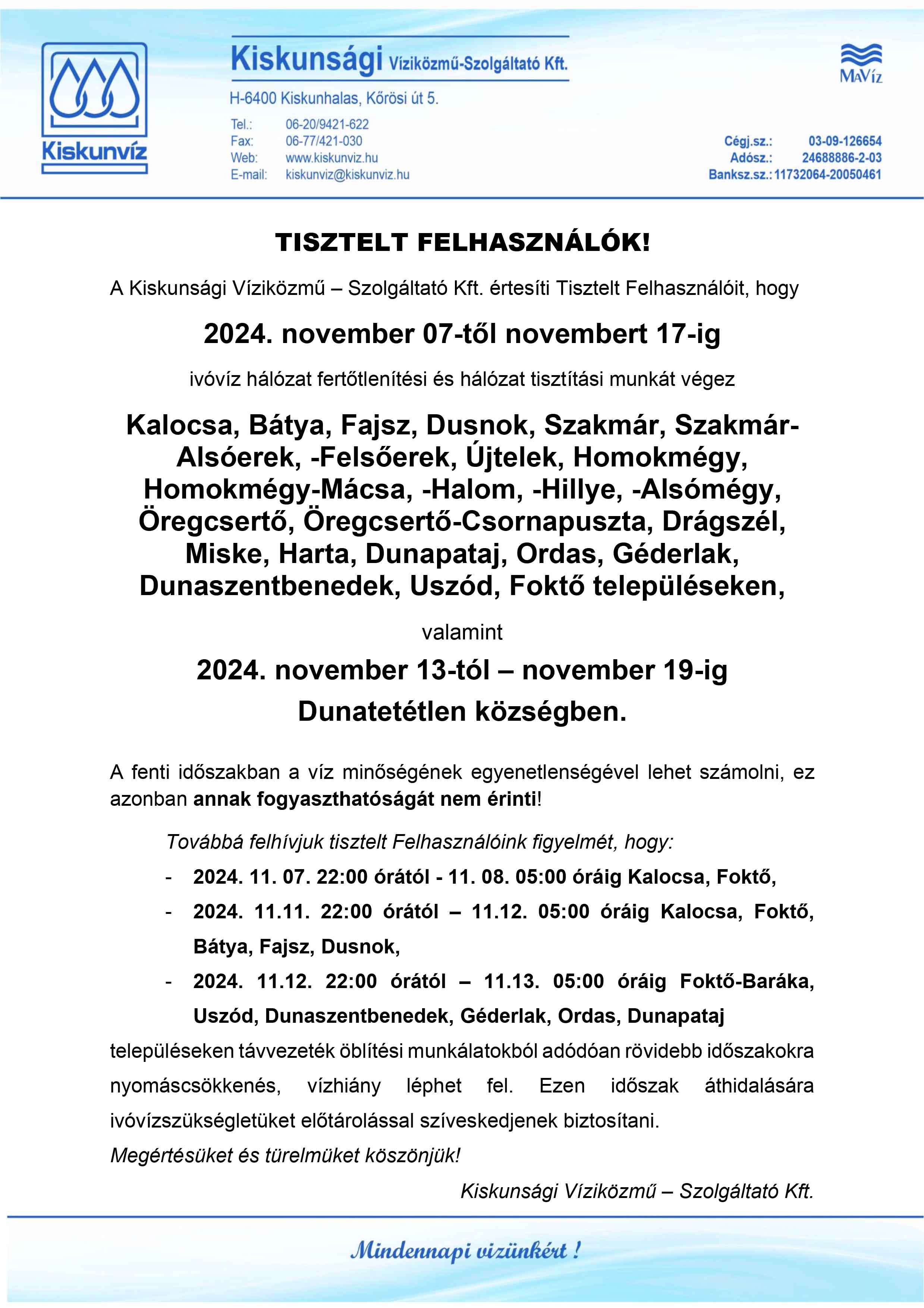 Ivóvízhálózat fertőtlenítés novemberben
